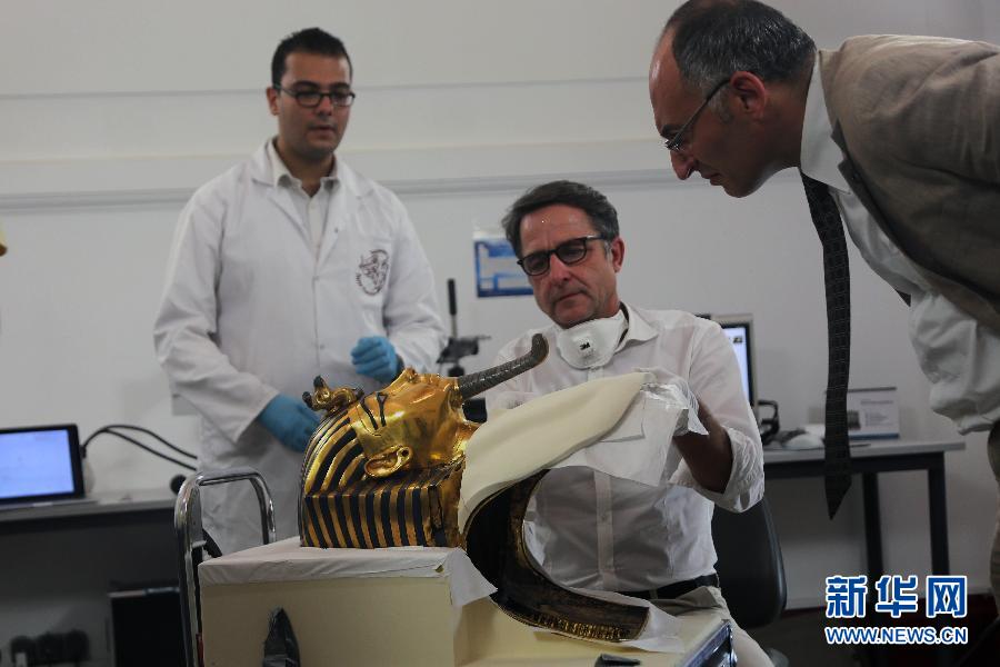 10月20日,在埃及开罗的埃及国家博物馆,德国专家克里斯蒂安·埃克曼在修复图坦卡蒙法老黄金面具。新华社发(艾哈迈德·戈马摄)