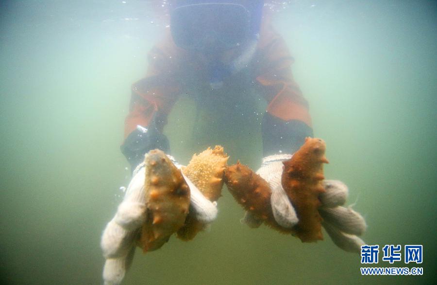 近日,辽宁省大连市金普新区鹿鸣岛海域进入辽刺参丰收季节。大连沿海出产的海参通称为辽刺参,为海参中的上品。鹿鸣岛作为辽刺参主产区之一,出产的海参肉嫩多刺,营养价值高。新华社发(朴峰 摄)