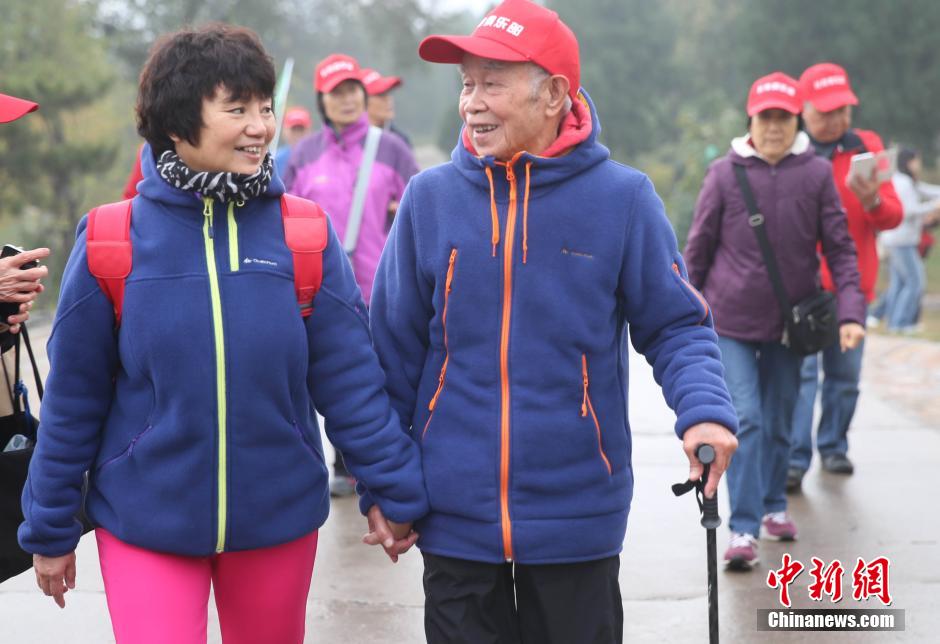 10月21日,中国传统重阳节,北京长寿俱乐部的500多名老人一同在北京西山国家森林公园参加登高活动。图为53岁的女儿茅亚平牵着88岁老父亲茅元准的手一同登高。中新社记者 杨可佳 摄