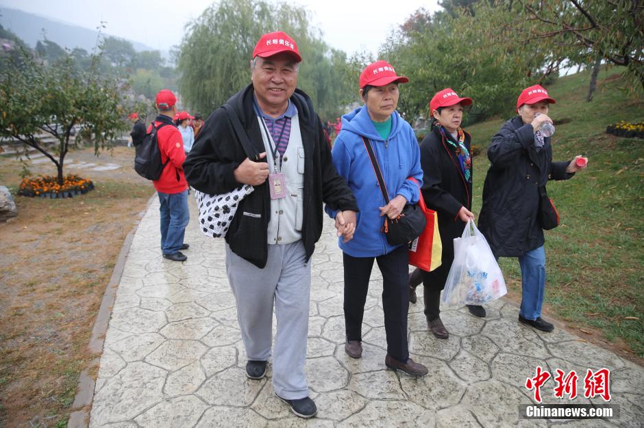 10月21日,中国传统重阳节,北京长寿俱乐部的500多名老人一同在北京西山国家森林公园参加登高活动。图为75岁的孙守文牵着70岁老伴儿孙玉兰的手一同登高。中新社记者 杨可佳 摄