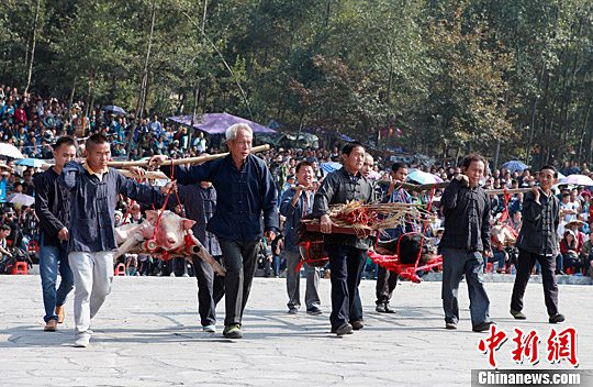 苗家人敬献五谷三牲。黄益民 摄