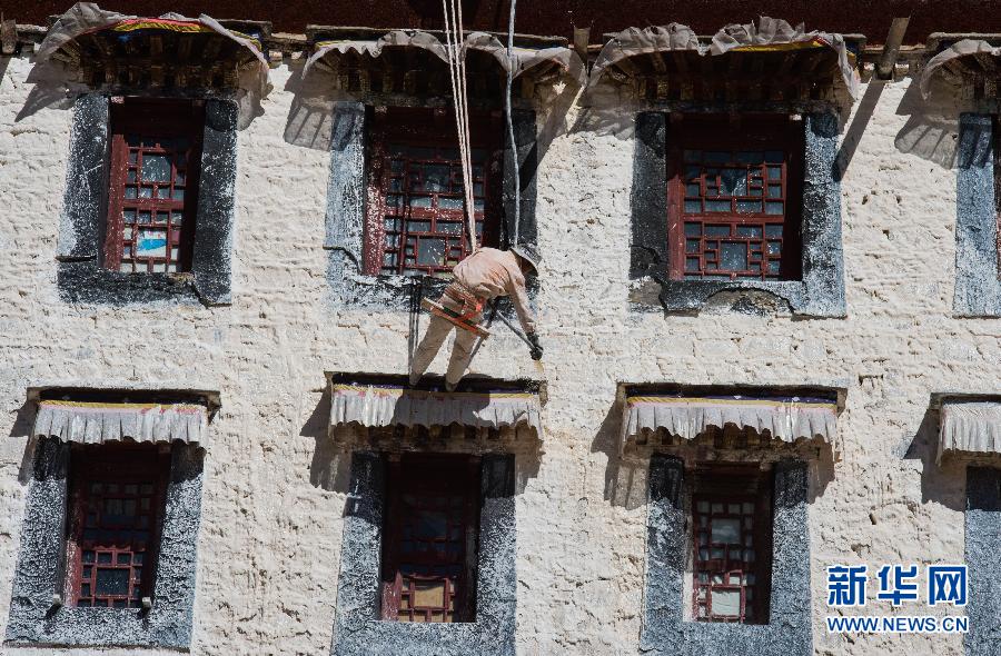 10月21日,工作人员用传统粉刷颜料粉刷布达拉宫。近日,西藏拉萨布达拉宫迎来一年一度的“换装季”。数十名工人对宫墙、白塔、窗框进行整体粉刷。 新华社记者 普布扎西 摄