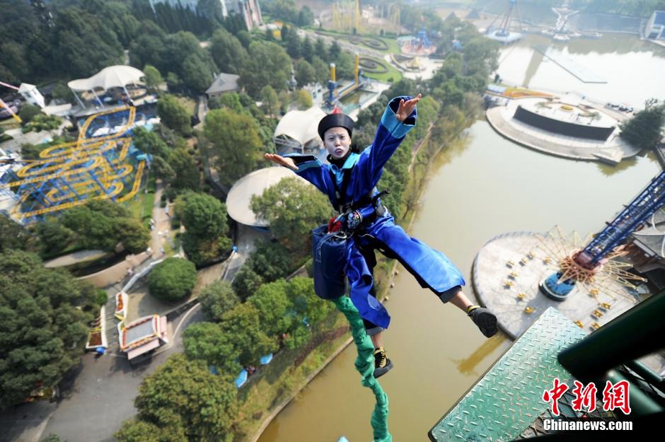 10月22日,正值万圣节前夕,湖南长沙世界之窗推出的各种万圣节活动吸引了众多游客前往。当日,工作人员装扮成各种“僵尸”迎接驱车前来的游客,并带领游客体验蹦极的刺激。 杨华锋 摄