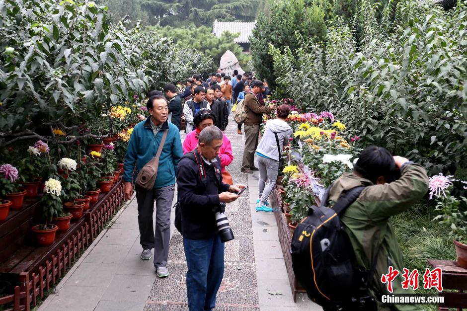 10月22日,以“花开盛世?菊韵泉城”为主题的济南市第三十六届趵突泉金秋菊展在泉城济南拉开帷幕。有来自本市16家单位和外地13家参展单位设置的菊花小景、造型、扎菊、大立菊、大悬崖菊、品种菊、专项品种菊、案头菊、盆景菊9个展项,500余个菊花品种、23组菊花造型和小景、共10万余盆菊花一起扮靓天下第一泉风景区。图为当日清晨开园不久,便引来众多游客拍照、参观。 程吉童 摄