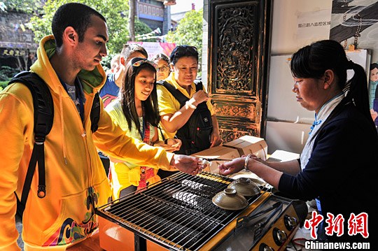 图为“汉语桥”选手品尝昆明特色美食“饵块”。中新社记者 任东 摄