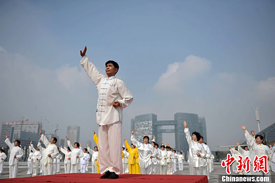 10月22日,1400名健身气功爱好者齐聚浙江杭州市民中心大剧院广场,开展2015年全国百城健身气功交流展示。中新社记者 徐昱 摄