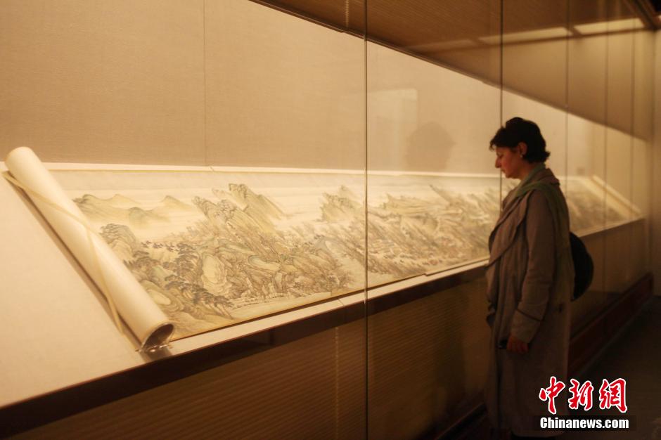 当地时间10月30日,参观者在纽约大都会博物馆中国书画精品展前驻足。纽约大都会博物馆将于10月31日正式推出馆藏中国书画精品展,韩干的《照夜白图》、黄庭坚的《廉颇蔺相如传》、李公麟的《孝经图》等110件传世经典将分两期与参观者见面。 中新社记者 邓敏 摄