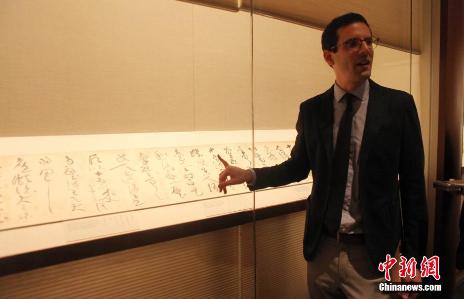 纽约大都会博物馆将于当地时间10月31日起推出馆藏中国书画精品展,韩干的《照夜白图》、黄庭坚的《廉颇蔺相如传》、李公麟的《孝经图》等110件传世经典将分两期与参观者见面。图为大都会博物馆中国书画部主任史耀华介绍北宋文学家、书法家黄庭坚的草书长卷《廉颇蔺相如传》。 中新社记者 邓敏 摄