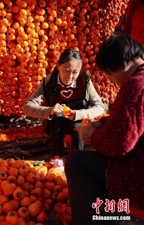 从山坡上摘下的柿子,村民将它们放在自家院落,用刨子去皮,再用绳子串起来挂在屋前。放眼望去,整个柿子沟村民屋前,挂柿子一排一排火红火红的,好不壮观! 秋歌 摄