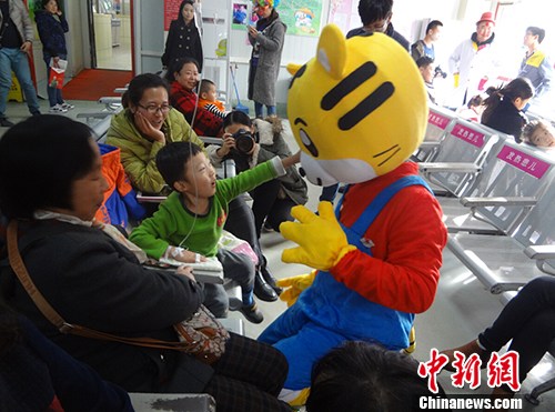 扮成巧虎的“小丑医生”与患儿交流。 陈晨 摄