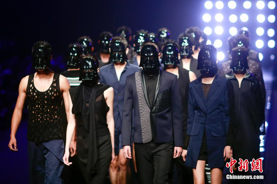 10月31日,戴着“星球大战”面具的模特在T台上展示设计师设计的时装。 中新社记者 盛佳鹏 摄