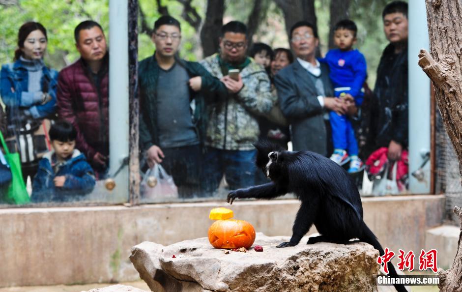 11月1日,一只白眉猴在享用南瓜。当日,济南动物园上演动物“抢南瓜”大战,长颈鹿、长臂猿、白眉猴等动物们快乐享用饲养员为它们准备的万圣节“南瓜宴”。