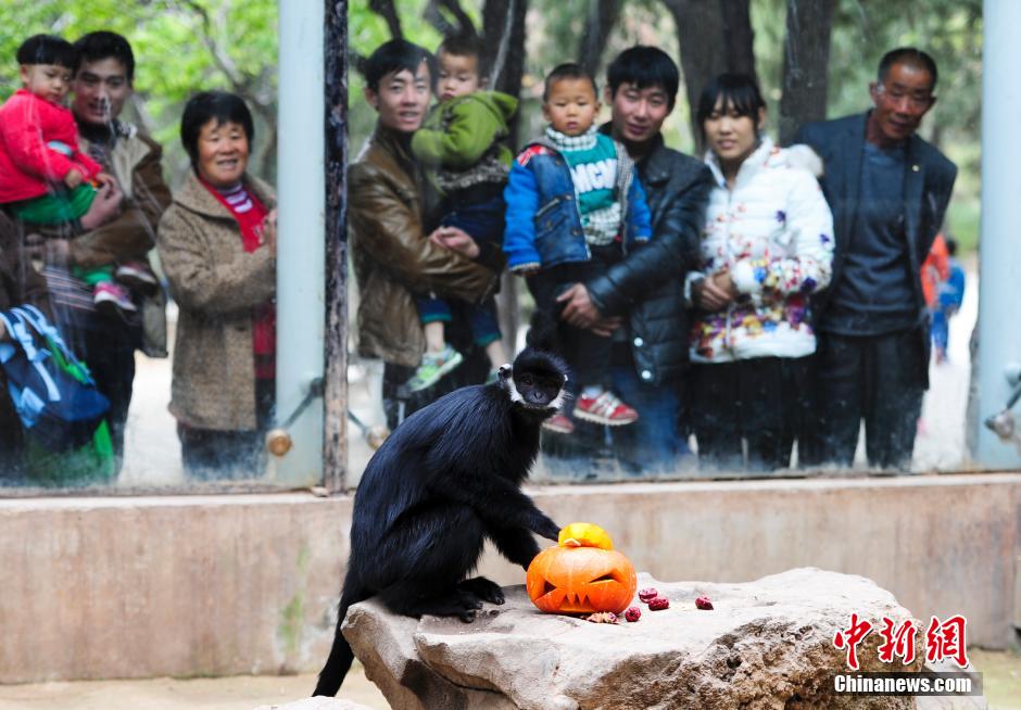 11月1日,一只白眉猴在享用南瓜。当日,济南动物园上演动物“抢南瓜”大战,长颈鹿、长臂猿、白眉猴等动物们快乐享用饲养员为它们准备的万圣节“南瓜宴”。