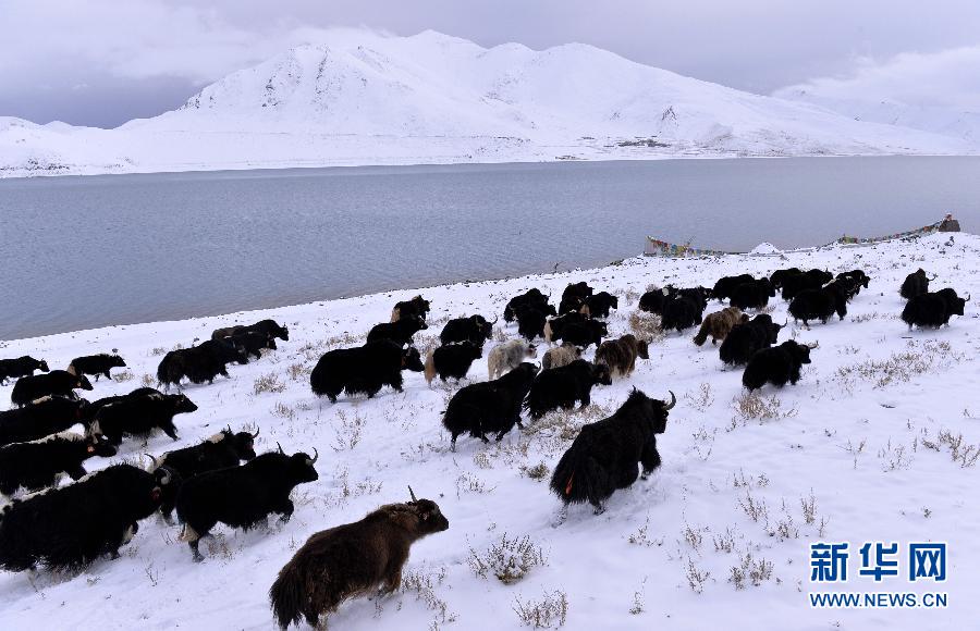 这是雪后羊卓雍错岸边的牦牛群(10月31日摄)。雪后的羊卓雍错在银装素裹的山脉以及白茫茫的天空映衬下显得晶莹剔透、静谧、圣洁。 新华社记者 刘东君 摄