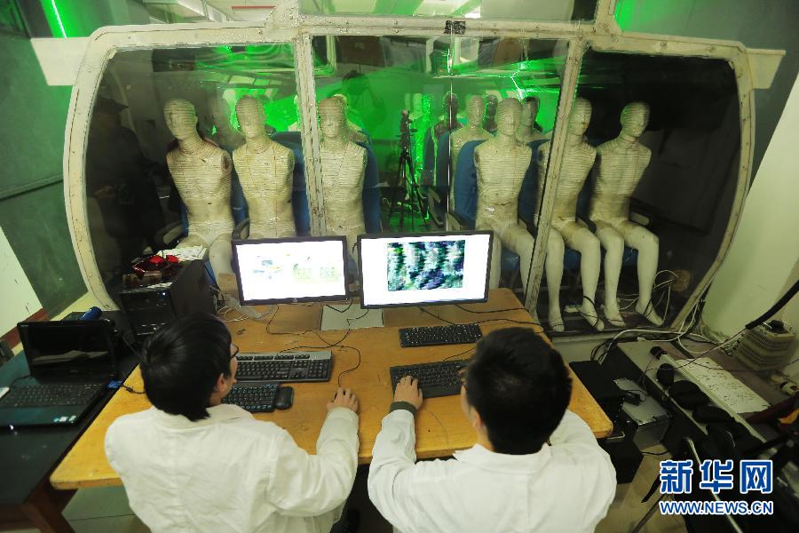 11月2日,科研人员在天津大学模拟座舱空气环境实验平台对机舱进行监测。 新华社发