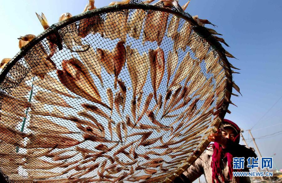 11月2日,渔民在江苏连云港市连岛沿海渔村晾晒鱼干。秋末初冬时节,江苏省连云港市沿海渔民抓紧天气晴好的气象条件,将捕获的鳗鱼、带鱼、黄鱼、鲳鱼等海产品进行腌制、晾晒,加工成鱼干销往市场以增加收入。新华社发(王健民 摄)