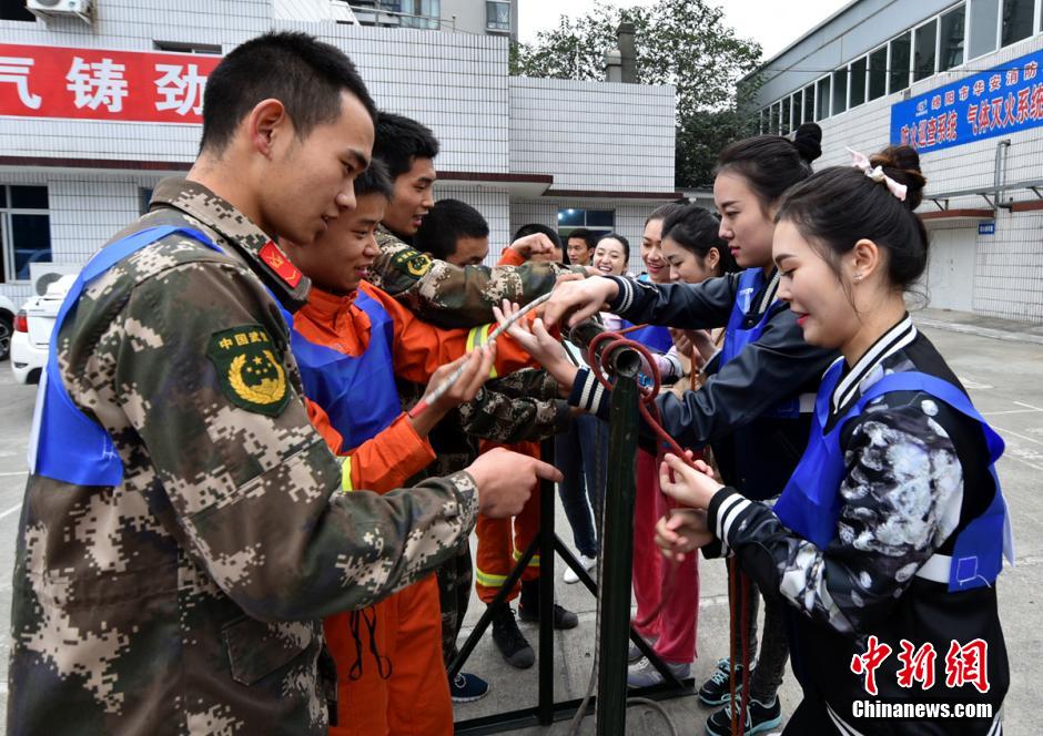 11月3日下午,15名身着制服的川航空姐、空少们走进四川绵阳消防支队特勤中队体验红门生活。图为消防官兵现场教空姐们绳结的打法。张金 摄