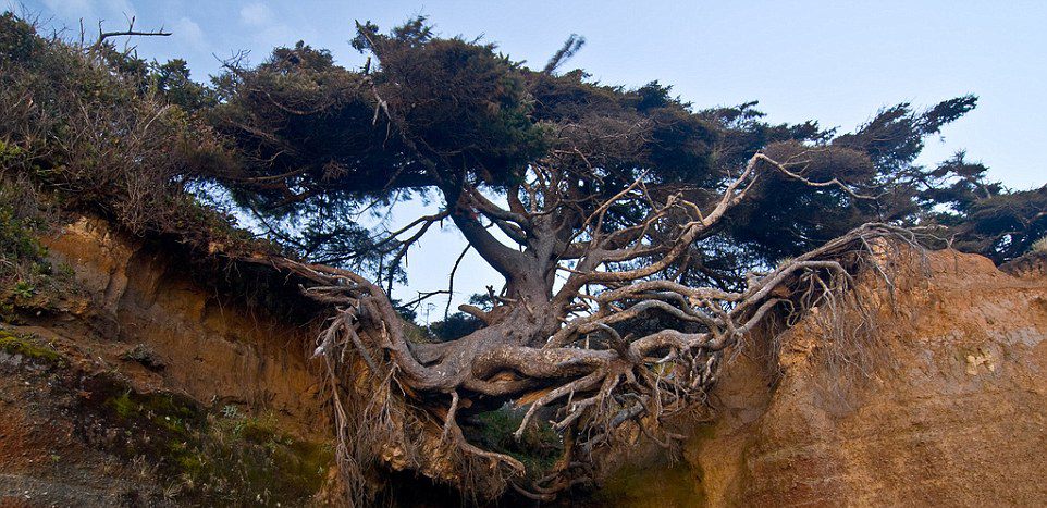 这棵大树大部分延伸到空中,只有少数几根卷须依附在坚硬岩石上,拼命维持生存。(网页截图)