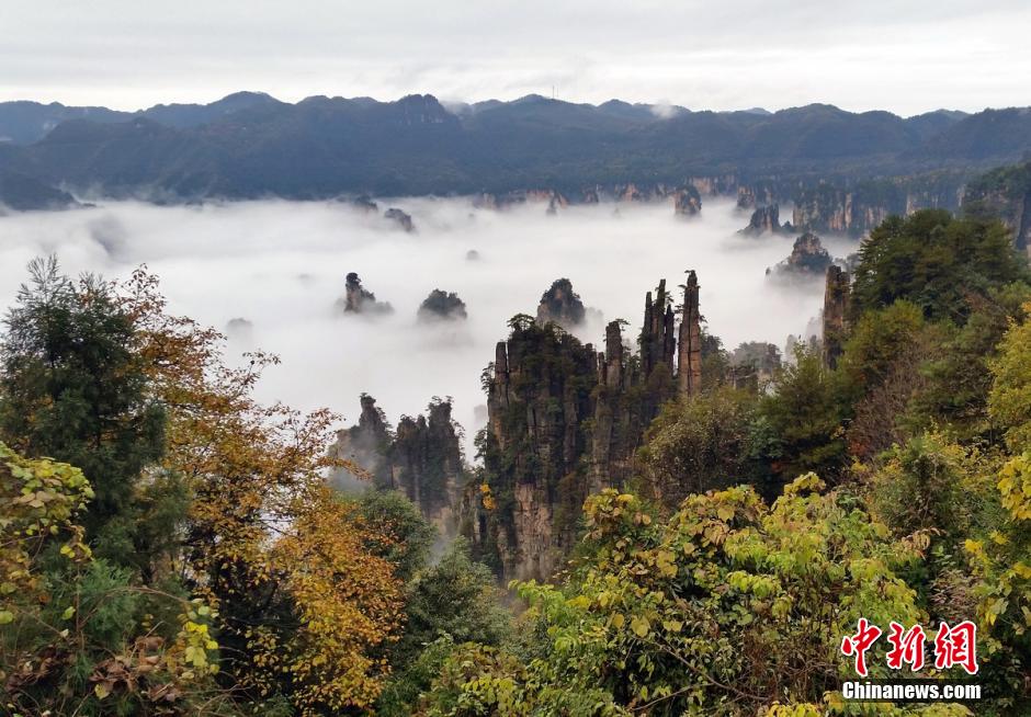 11月20日,连日降雨过后,湖南张家界武陵源核心景区出现成片云海景观,云雾缠绕在俊俏挺拔的山峰间,漫过天际,犹如仙境。 吴勇兵 摄