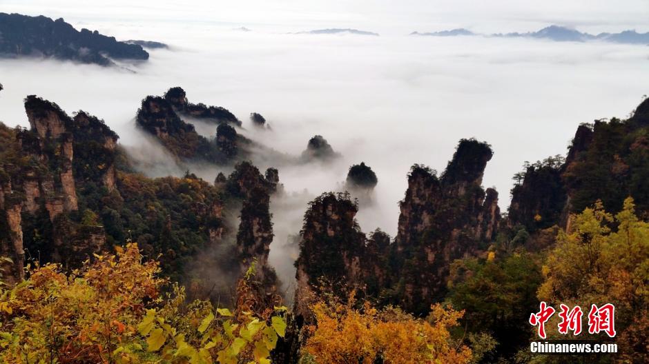 11月20日,连日降雨过后,湖南张家界武陵源核心景区出现成片云海景观,云雾缠绕在俊俏挺拔的山峰间,漫过天际,犹如仙境。 吴勇兵 摄