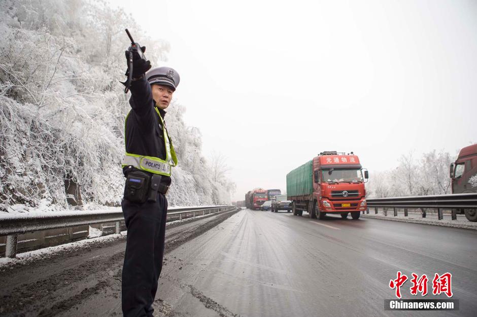 11月23日,受强冷空气影响,中国中东部大部地区近日出现明显降雪并伴随大幅降温,受降雪和道路结冰影响,部分路段通行受阻。图为山西高速交警在冰天雪地中指挥疏导交通。 张云 摄