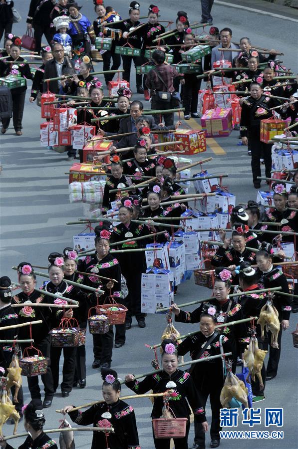 11月23日,外嫁的“姑妈”挑着各种礼品回娘家。当日是贵州省黔东南苗族侗族自治州雷山县苗族新年的大年初一,雷山县大塘镇掌坳村外嫁的数百名身着节日盛装的妇女和丈夫挑着鸡鸭鱼和糖果,抬着米酒和猪,邀约欢聚在山下村口,集体回娘家过苗年。掌坳村的娘家人放起鞭炮吹起芦笙敲起铜鼓迎接,喜气洋洋热闹非凡,洋溢着浓浓的苗族年味。在雷山县苗族地区,寨子里对嫁出去的姑娘统称为姑妈。嫁出的女儿集体回娘家过苗年,是当地苗族同胞世代传承的习俗。新华社发(秦刚 摄)