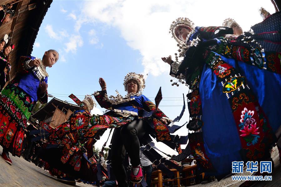 11月23日,掌坳村回娘家的“姑妈”跳起欢快的芦笙舞。新华社发(秦刚 摄)