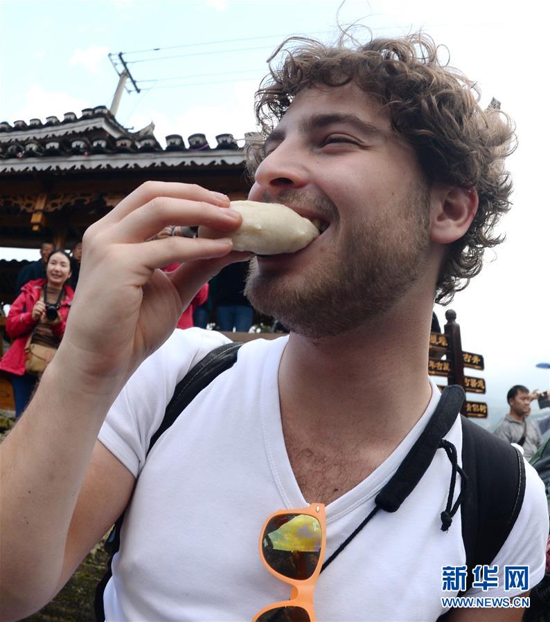 11月23日,一名外国游客在掌坳村回娘家活动中品尝糍粑。新华社发(秦刚 摄)