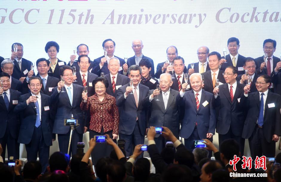 11月27日,香港中华总商会115周年会庆酒会在香港举行,全国政协副主席董建华(右四)、全国政协副主席李海峰(左四)、香港特区行政长官梁振英(左五)、中华总商会会长杨钊(右三)等出席。