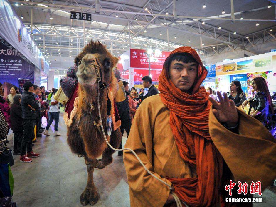 11月27日,为期3天的“第十届中国新疆冬季旅游产业交易博览会暨中国西部冰雪旅游节”(以下简称“冬博会”)在新疆国际会展中心开幕。本届“冬博会”吸引了15个国家和地区、全国31省、市、自治区及港澳台地区的旅游管理机构、旅游协会、旅行社、旅游产业相关企业等众多参展商参展。据介绍,本届“冬博会”将向民众发放5万张冰雪游体验卡,持卡者可在乌鲁木齐市周边的5家滑雪场免费滑雪,还可去天山大峡谷景区体验冰雪娱乐项目。图为某企业请来演员装扮成古丝绸之路客商,牵着骆驼在展区中“穿越”。中新社记者 刘新 摄