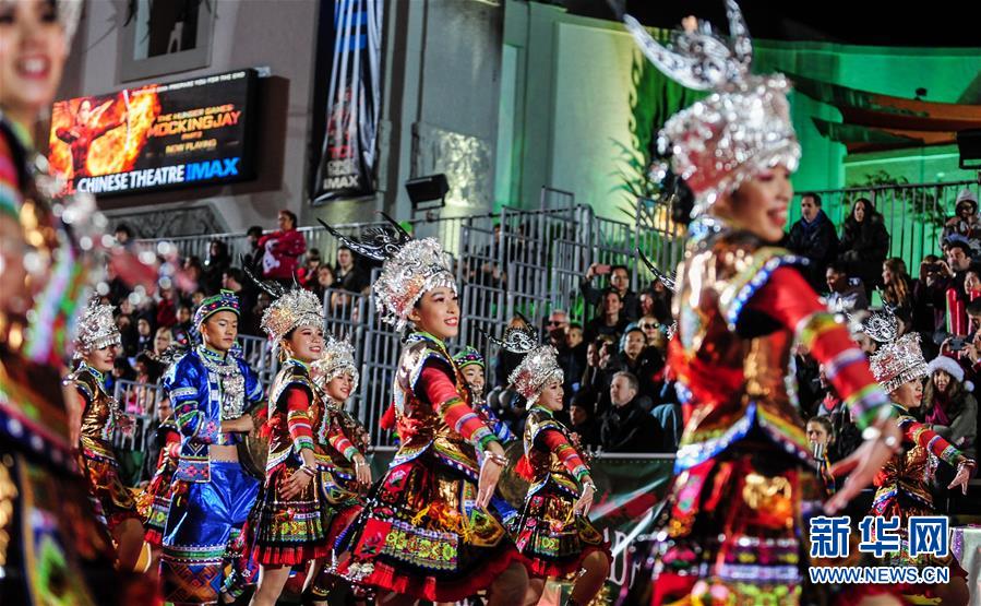 11月29日,来自中国广西财经学院大学生艺术团的学生们在美国好莱坞圣诞游行上奉献精彩的民族舞蹈表演。当日,第84届好莱坞圣诞游行在洛杉矶好莱坞大道上演,上百支花车和游行方队列队经过TCL中国剧院和奥斯卡奖颁奖地杜比剧院门口,吸引数千名美国民众和世界各地的游客聚集在街道两边观看。新华社记者 张超群 摄