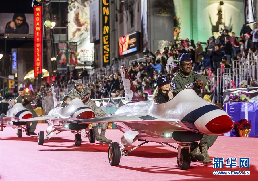 11月29日,在美国洛杉矶,空军小型飞机团队从好莱坞大道中国剧院前经过。当日,第84届好莱坞圣诞游行在洛杉矶好莱坞大道上演,上百支花车和游行方队列队经过TCL中国剧院和奥斯卡奖颁奖地杜比剧院门口,吸引数千名美国民众和世界各地的游客聚集在街道两边观看。新华社发(赵汉荣摄)