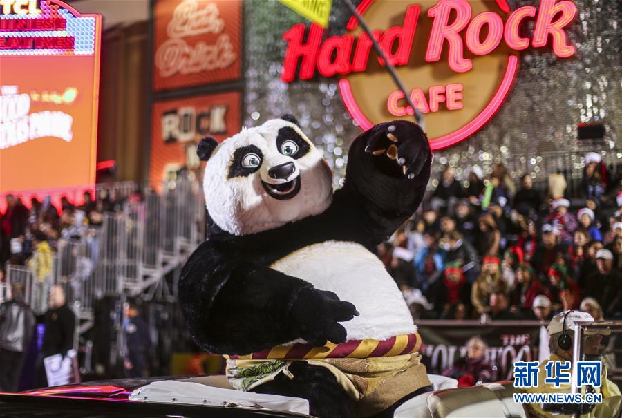 11月29日,在美国洛杉矶,功夫熊猫游行队伍从好莱坞大道中国剧院前经过。当日,第84届好莱坞圣诞游行在洛杉矶好莱坞大道上演,上百支花车和游行方队列队经过TCL中国剧院和奥斯卡奖颁奖地杜比剧院门口,吸引数千名美国民众和世界各地的游客聚集在街道两边观看。新华社发(赵汉荣摄)