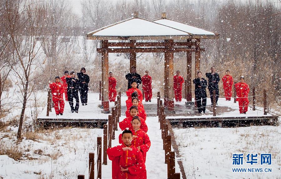 12月1日,内蒙古呼和浩特市玉泉区小召小学的师生在雪中练习太极拳。当日,内蒙古呼和浩特市南湖湿地公园迎来小雪,该市玉泉区小召小学“太极社”的学生在老师的带领下来到湿地公园,在雪中练习太极拳,舒展身心,锻炼体魄。新华社发(丁根厚 摄)