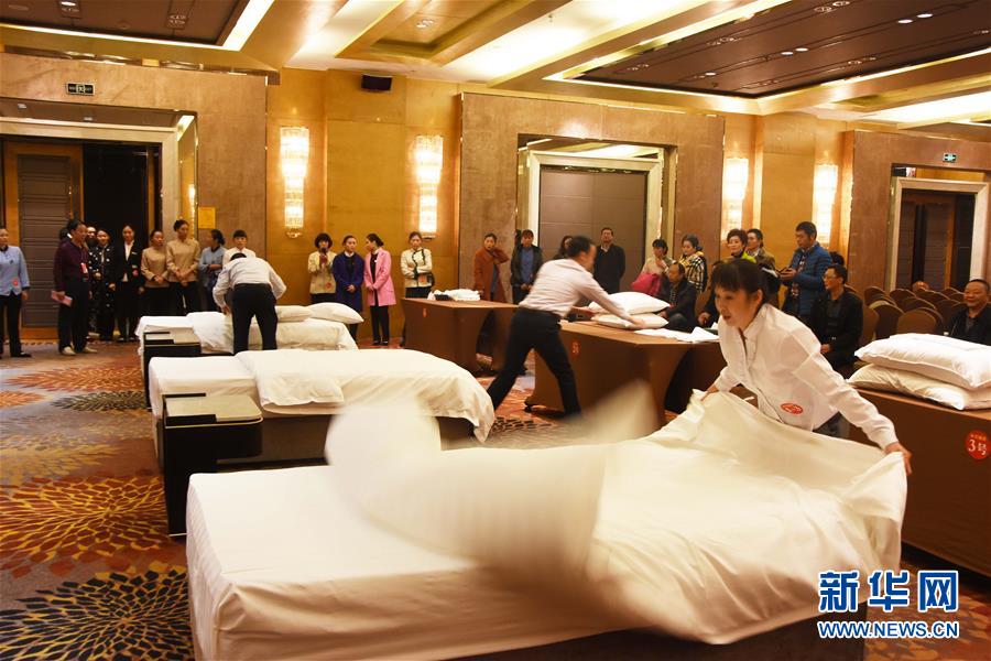 12月2日,参赛选手在参加中式铺床比赛。新华社发(王忠虎 摄)