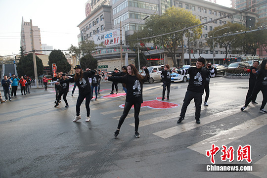 交通志愿者在桃心斑马线齐跳“斑马舞”,旨在传递文明交通的理念。 史静静 摄