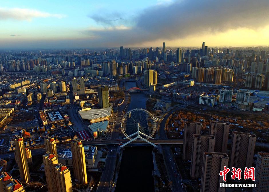 12月2日下午,受大风影响,津城连续多日的雾霾自北向南减弱消散,重现蓝天。图为地标建筑天津之眼的霞光。 中新社记者 佟郁 摄