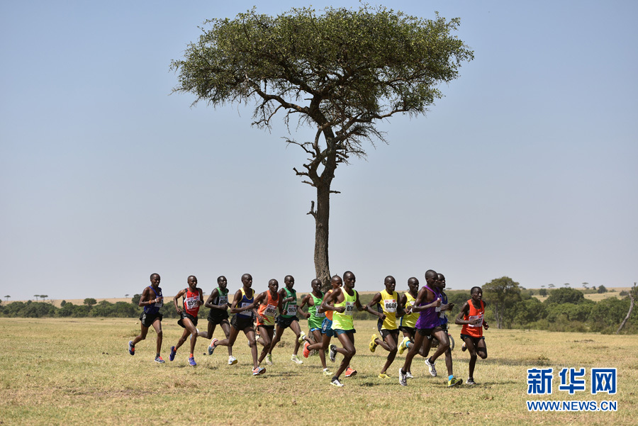 8月15日,在肯尼亚马赛马拉国家野生动物保护区,参加第七届马赛马拉马拉松赛的选手在比赛中角逐。新华社记者 孙瑞博摄