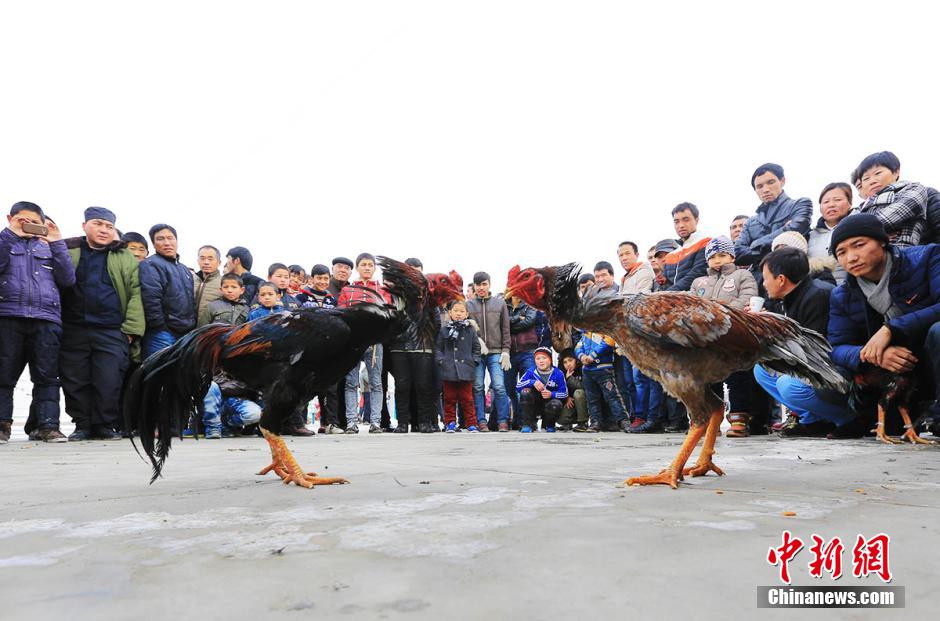 12月12日,新疆巴音郭楞蒙古自治州博湖县塔温觉肯乡科克莫敦村村委会大院,一场斗鸡比赛正在激情上演。 年磊 摄