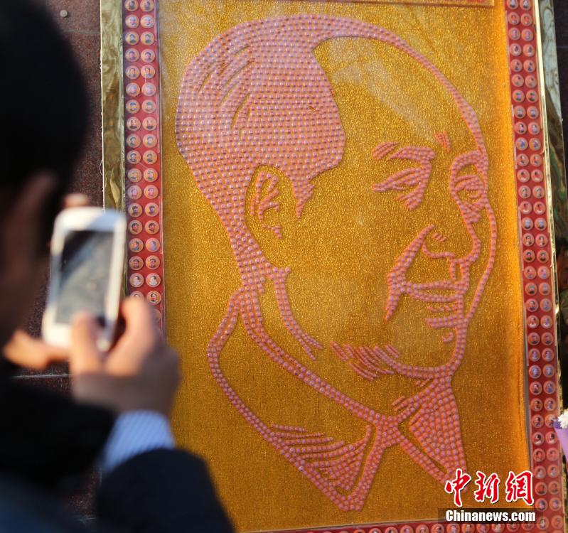 12月26日,是毛泽东诞辰122周年纪念日,郑州退休老军人李廷林制作的徽章版毛泽东画像在河南郑州紫荆山广场展出,该画像总共由1828枚徽章围成。中新社记者 王中举 摄