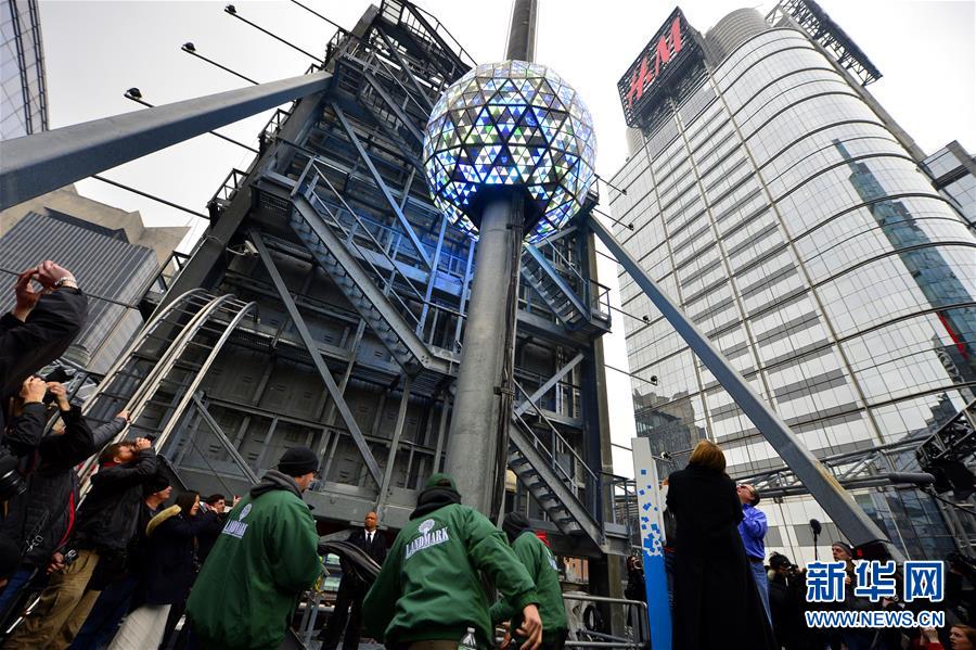 12月30日,在纽约时报广场,技术人员对新年夜倒数活动使用的水晶球进行升降测试。 新华社记者王雷摄