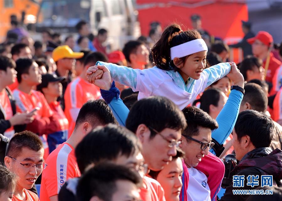 1月2日,一名家长带着小孩在起跑点上起跑。新华社记者张国俊摄