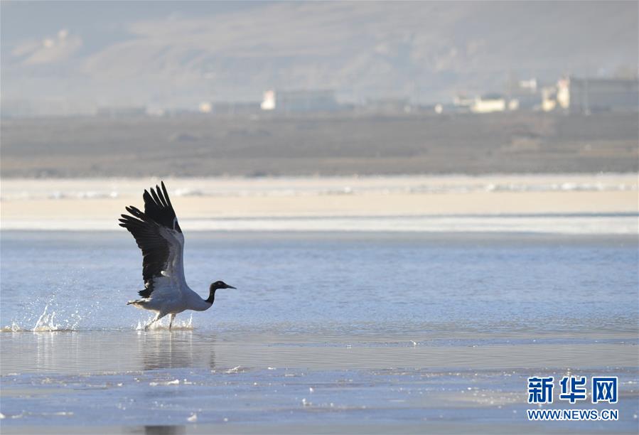 1月2日,在位于西藏林周县的雅鲁藏布江中游河谷黑颈鹤国家级自然保护区,一只黑颈鹤准备飞翔。近年来,由于冬季气候温暖,加上大量遗留的青稞、小麦以及草根为黑颈鹤提供了丰富的食物,雅鲁藏布江中游河谷黑颈鹤国家级自然保护区逐步成为黑颈鹤越冬的理想家园。新华社记者 张汝锋 摄