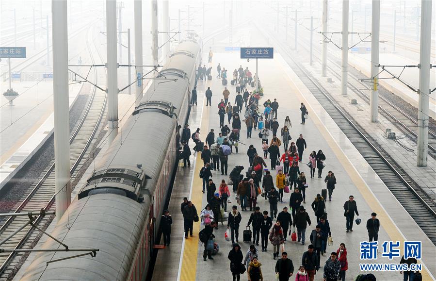 1月10日,旅客在石家庄火车站下车。 1月10日零时起,全国铁路实行新的列车运行图,增开旅客列车285.5对,其中增开动车组列车281.5对。运行图调整后,全国铁路开行旅客列车总数达到3142对,其中动车组列车1980.5对。新华社记者 朱旭东 摄