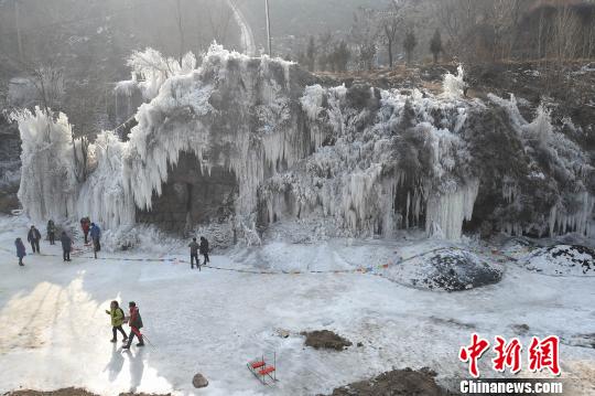 1月10日,山西太原店头村,一处高约30米、宽百米的冰瀑风景颇为壮观,有如冰雪童话世界,引得不少游人前去观赏体验。据了解,如此特别的“冰雪世界”景观为当地村民自制而成,村民夜晚在此处用水管从高到低进行浇灌,入夜气温寒冷,液体凝结成冰挂,最终形成冰瀑景观。