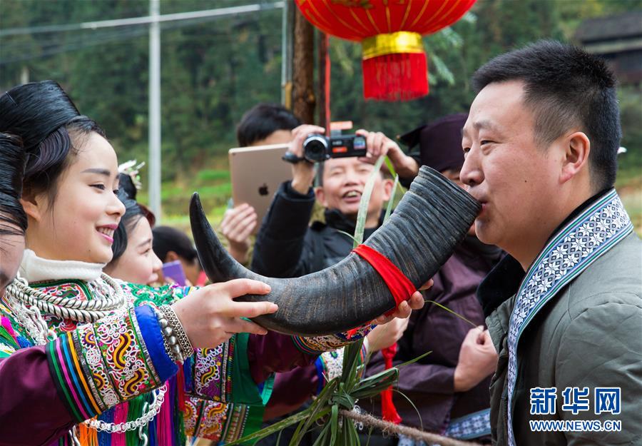 1月10日,在榕江县扒王侗寨,侗族姑娘向前来过侗族新年的客人敬酒。当日是贵州省榕江县扒王侗寨侗族大年初一,当地侗族同胞伴随着侗族歌师弹奏的琵琶歌,欢乐踩歌堂,迎接侗族新年的到来。“踩歌堂”是侗族祭祀神灵,祈求人畜兴旺、五谷丰收的盛大集体活动。新华社发(黄万鑫 摄)