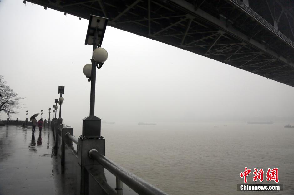 1月11日,行人走在武汉长江边,雨雾笼罩的武汉长江大桥若隐若现。中新社记者 张畅 摄