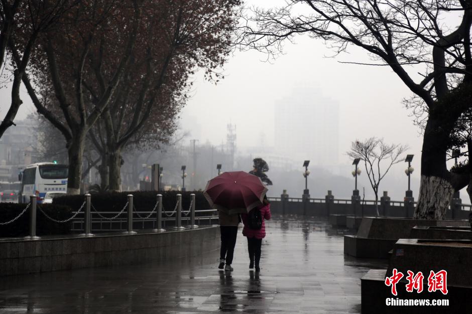1月11日,行人走在武汉长江边,雨雾笼罩的武汉城市建筑若隐若现。中新社记者 张畅 摄
