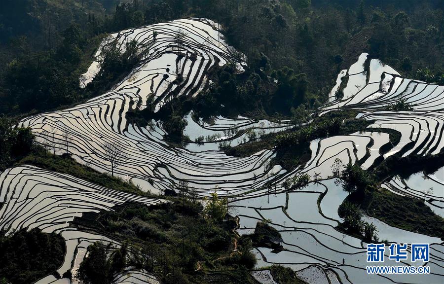这是云南省红河州元阳县的哈尼梯田美景,形似奔马(1月11日摄)。
