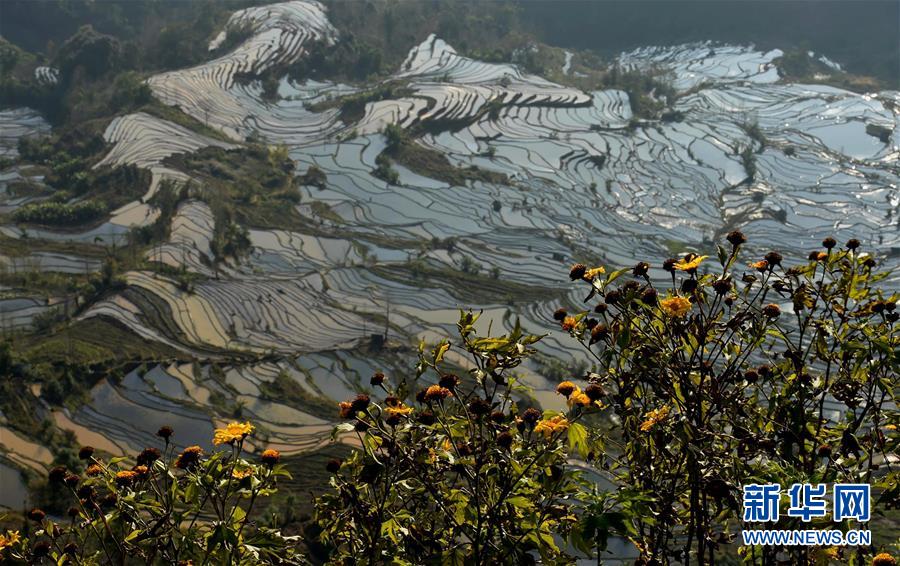 这是云南省红河州元阳县野花掩映下的哈尼梯田美景(1月11日摄)。